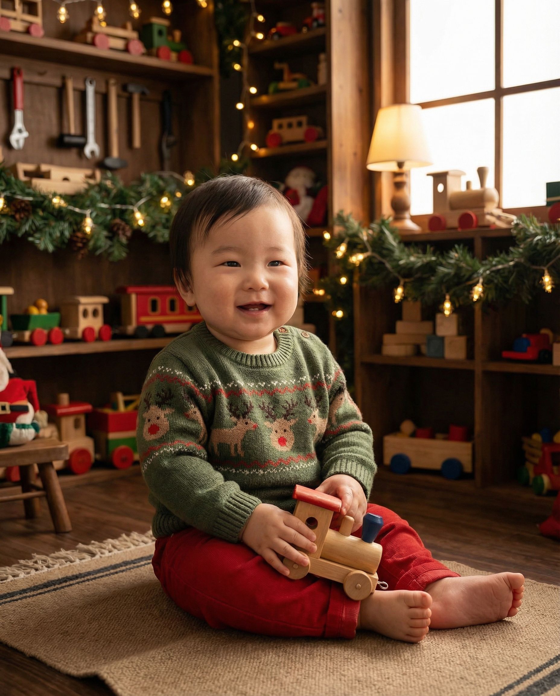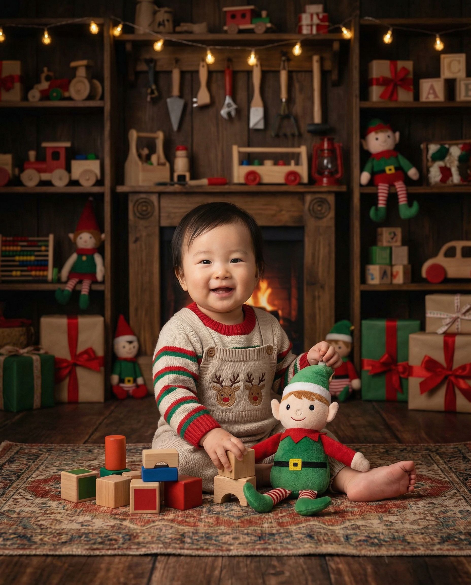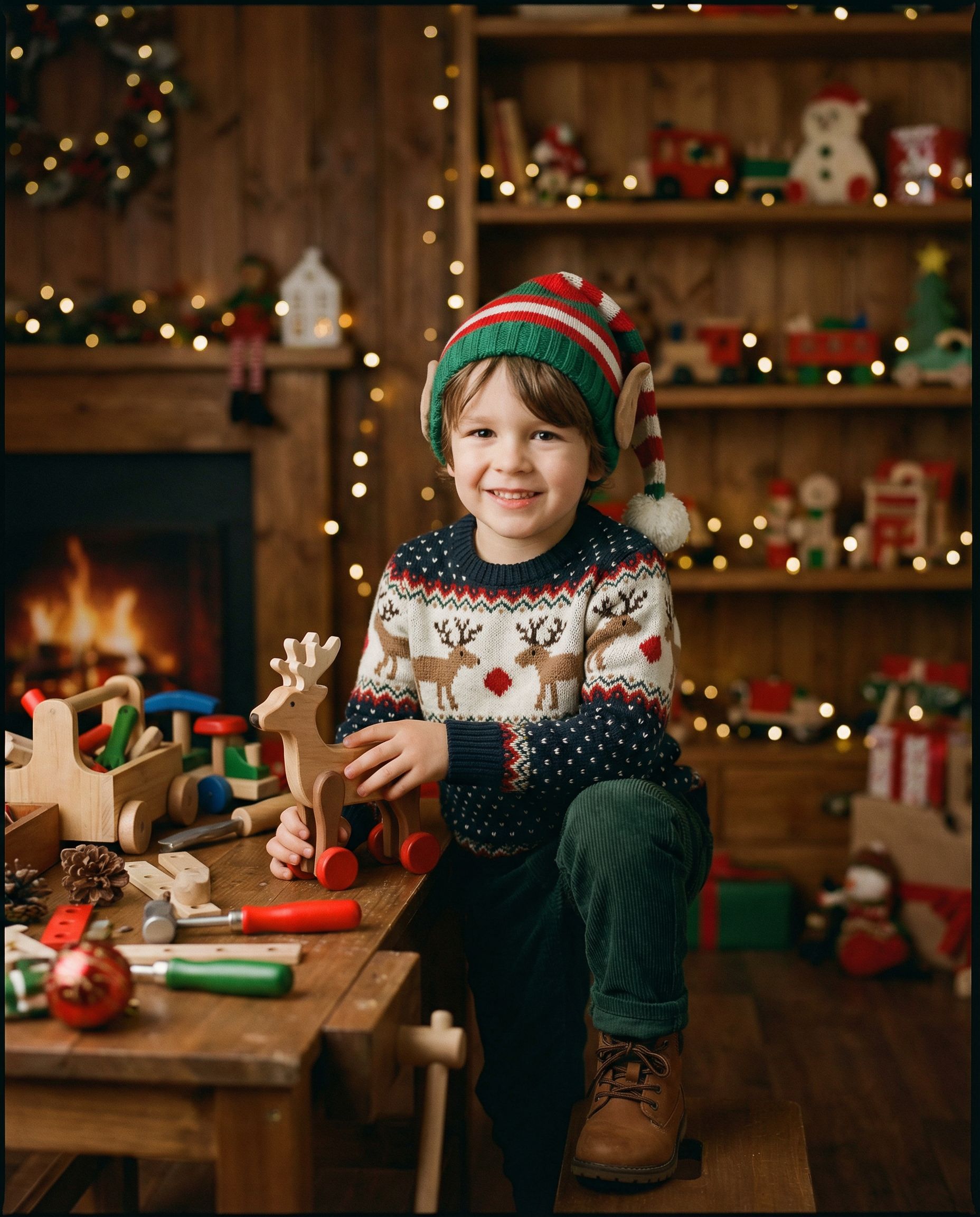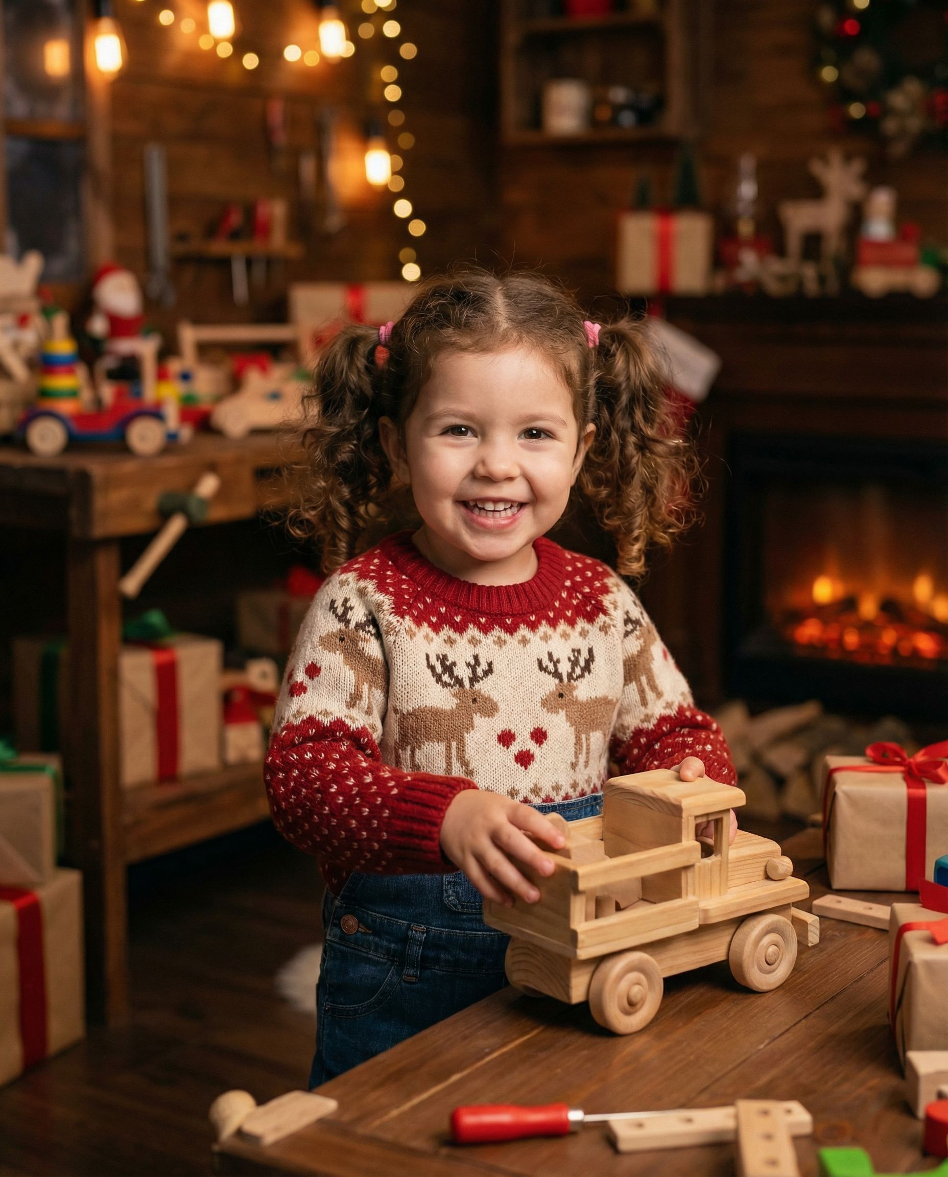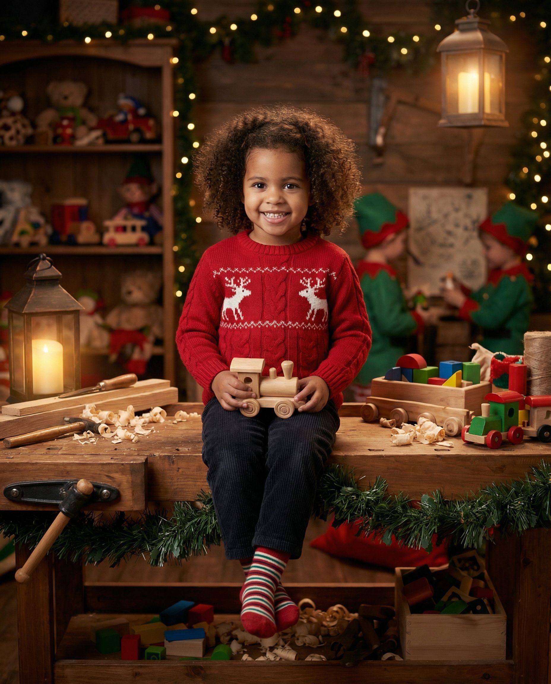 Whimsical but tasteful workshop with toys and soft magical lighting — kid-focused, not cringe.